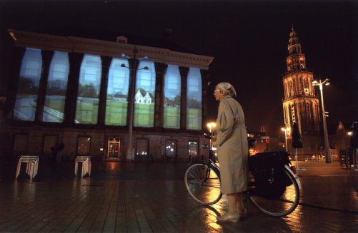 Geplaatst op: 9 februari 2006 Hoort bij: Kunsten Een reactie plaatsenAangetroffen op de site van Anne Hilderink. Projectie op het Groninger stadhuis van het landschap bij Aduarderzijl. Stad en land ineen, of Laagland op een voetstuk. Vijf jaar geleden alweer.