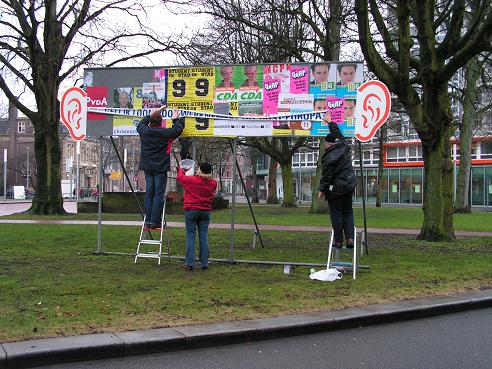 Leden van FNV Bondgenoten waren vanochtend op het Hereplein aan het stoethaspelen met een heeeel breed affiche. Ze voeren actie, opdat de Polen die hier komen evenveel loon krijgen als Nederlandse werknemers. Omdat er enige twijfel bestond aan de luistervaardigheid bij de politiek, zetten de vakbonders ook twee oren aan het verkiezingsbord. Maar als je op hun eigen site kijkt hoe de vlag erbij hangt, blijkt het allemaal nog wel mee te vallen met die openstelling van de grenzen op de Internationale Dag van de Arbeid.