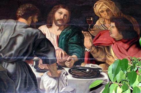In de ogen van de kerkeraad moest die schildering een bijbelverhaal al te platvloers hebben toegepast op de herberg. Dat verhaal, uit het evangelie van Lucas, is inderdaad zeer toepasselijk op een herberg. Als twee mannen naar Emmaus lopen, een gehucht even buiten Jeruzalem, en onderweg de kruisiging en de verdwijning van Christus’ lichaam bespreken, voegt zich een derde, aanvankelijk onbekende man bij hen. In Emmaus gearriveerd, nodigen ze deze persoon uit om met hun mee te gaan, de herberg in: “Blijft bij ons, want het is bij de avond, en de dag is gedaald”. En terwijl de vreemdeling het brood neemt, breekt, zegent en aan zijn metgezellen uitdeelt, herkennen zij hem: het is zowaar Christus, die uit de dood is opgestaan.