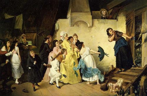 Op een ruime zolder heeft de schilder maar liefst negentien vrouwen neergezet, die bijna allemaal één gemoedsgesteldheid uitdrukken, die van vrees. Veel van de dames hebben een nachtpon aan, kennelijk lagen zij reeds te bed, toen sommige hunner boven op zolder zekere geluiden vernamen, welke het vermoeden deden rijzen dat het daar niet pluis was. Met zijn negentienen gingen de dames erop af. Sommigen wapenden zich voor alle zekerheid met een paraplu, een wafelijzer, of een kleerborstel. De dienstbode van het huis, te herkennen aan haar eenvoudiger kledij, mag de kastdeur opentrekken van waarachter het lawaai komt. In die kast zijn, heel vaag, de contouren van twee katten zichtbaar. Straks zullen zij gaan zorgen voor een grote opluchting bij de dames.
