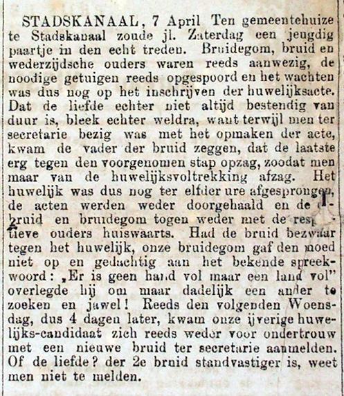 Curieus verhaal, zeg! Ook zo curieus was het verhaal dat mij omstreeks 1962 verteld werd toen ik “in Stad” werkte. Een bruidspaar was in de trouwauto op weg naar het Stadhuis, aan het hoofd van de stoet. Vlak voor de Grote Markt verzocht de bruidegom de chauffeur om even te stoppen, hij wou nog een pakje sigaretten kopen. Hij liep de dichtstbijzijnde hoek om, en kwam niet terug…