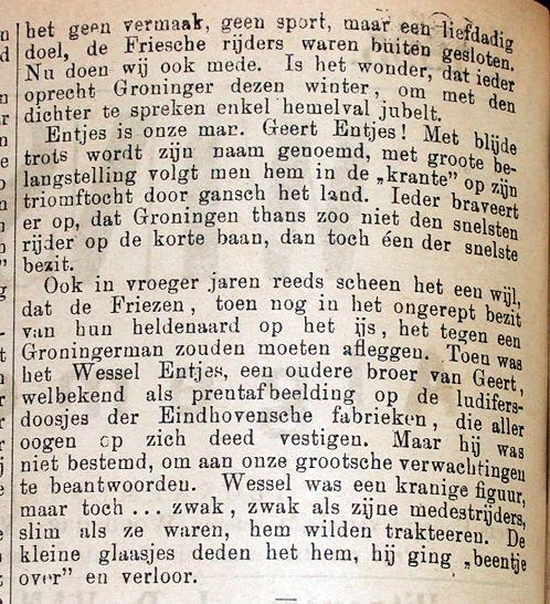 Afgaande op dit lijstje met palmares mag Geert dan de grootste “coryphee” van de twee geweest zijn, toch lijkt het er sterk op dat zijn oudere broer meer indruk maakte. Zo komt Wessel voor in de ingezonden brief van Dr. Botto Schultetus Aeneae die op 21 december 1885 in de Leeuwarder Courant stond. Aan het eind van dit epistel daagde deze medicus de organisatoren van Friese hardrijderijen uit om ook eens “Willem” (hij bedoelde natuurlijk Wessel) Entjes te inviteren. Volgens hem was Wessel “een brutaal en uitmuntend rijder”. “Als de man zich spaart en ook daardoor bespaart is hij voor de speedrijders der Friezen als altijd een zeer zware partij”, aldus Schultetus. “In Groningen worden de Friezen op hardrijderijen zoo loyaaal behandeld, dat gij hun dit compliment, aan een uitmuntenden hardrijder, die de beste Friezen de broek heeft warm gemaakt, niet onthouden moogt.”
