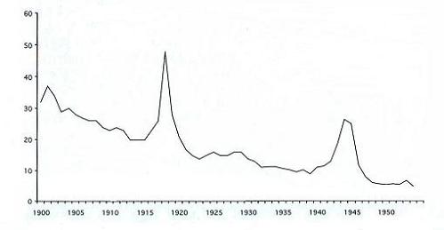 Volgens mij zie je een dalende trend, die stopt bij WO I, dan een stijging door WO I en dan een gigantische piek door de Spaanse Griep.