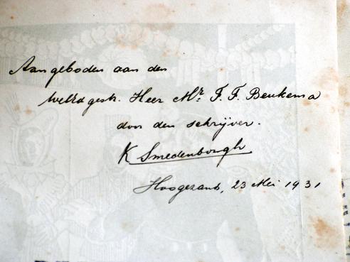 Mogelijk heeft de fabrikant ook als mecenas voor Smedenborgh gefungeerd. Getuige stempels en een leenrooster voorin – lenen kostte 2 cent per twee weken – raakte dit exemplaar van ‘Heintje Plezier’, waarschijnlijk na zijn dood (1936), in het bezit van ‘De droge kroeg‘, een door een christelijke geheelonthoudersvereniging opgericht opvangcentrum voor ex-alcoholisten aan de Kostersgang. Daar is het boek nogal beduimeld geraakt.