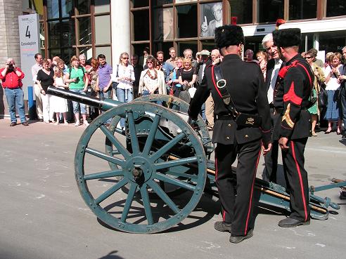 Vooraf was hem voor één dag vergunning verstrekt teneinde een kanon af te mogen schieten binnen de bebouwde kom. Op het moment suprème ontstelde de klap me zo hevig, dat ik als fotograaf weinig meer waard was. Vandaar dat ik moet volstaan met een rustig plaatje van de stoomcursus kanon afschieten die de CdK aangeboden kreeg: