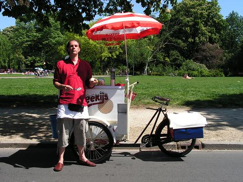 Gezien aan de Oranjesingel, bij de grote speelweide van het Noorderplantsoen. Het bedrijf van zijn baas, Steekjelos, had ook nog een website,waaruit blijkt dat je zo’n ijscoman met kar en al in kunt huren bij al je zomerfeesten en -partijen.