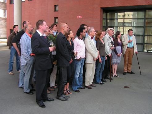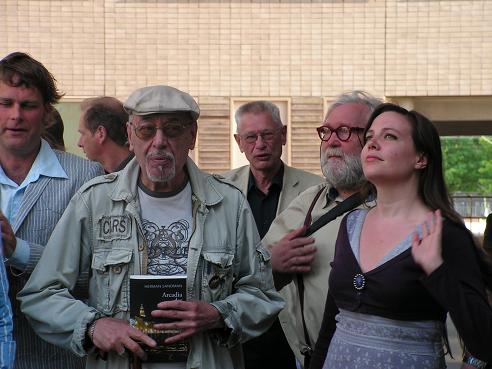 Op de tweede rij is ’s Rijks officiële dichter Driek van Wissen te ontwaren. Eerste rij vlnr: Jean-Pierre Rawie, Tjitse Hofman, Anneke Claus, wat onbekenden, Kees van der Hoef, Ellen Deckwitz en Gerrit Krol: