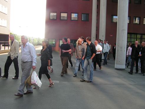 De aftocht na het poseren. Hubert Klaver wordt mooi uitgelicht, achter hem, in het witte shirt, Bill Mensema: