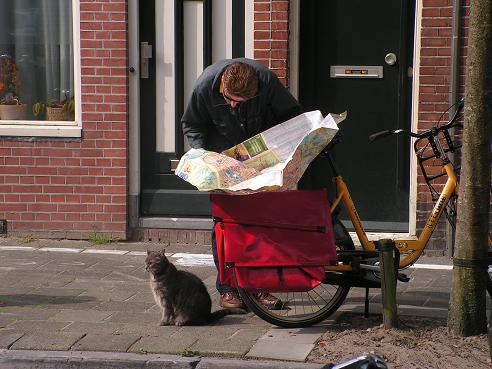 Die postbode is wel een beetje laat met het zoeken van dat adres. Dat had hij beter vooraf via de routeplanner kunnen doen. Of gewoon de tom-tom op de fiets zetten…