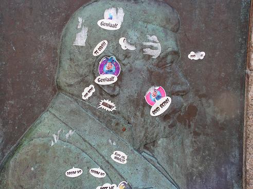 Ik durf bijna te wedden dat de plakkers helemaal niet beseft hebben waarop ze plakken. Die zitten op een bankje en douwen een sticker ergens op. Ik moet je eerlijk bekennen dat ik daar in mijn pubertijd ook geen oog voor had. Dan ben je met andere zaken bezig (zoals verliefd op een bankje zitten bijvoorbeeld). Ik heb echter nooit andermans eigendommen of kunstwerken vernield. Dat dan weer niet…