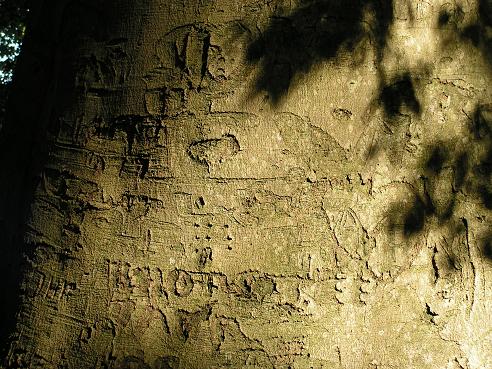 Beuk met ingekerfde letters en hartjes in de bast, sterrebos Oosterbroek: