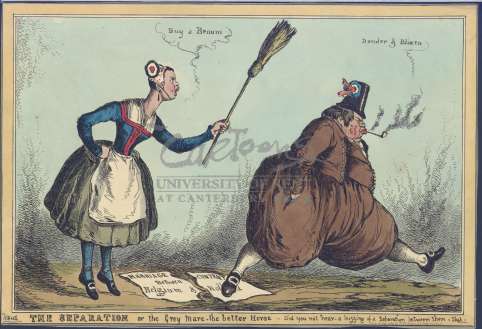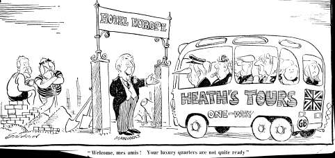 De internetversie van het British Cartoon Archive ging gister open. Op bovenstaande plaat modelleerde William Heath de Belgische afscheiding van 1830 naar een scène uit een indertijd bekende opera. Op de onderstaande laat Leslie Gibbard van the Guardian scheidend eurocommissaris Sicco Mansholt de Britten onder leidimng van Edward Heath verwelkomen in een zeer onafgebouwd hotel Europa (1973):