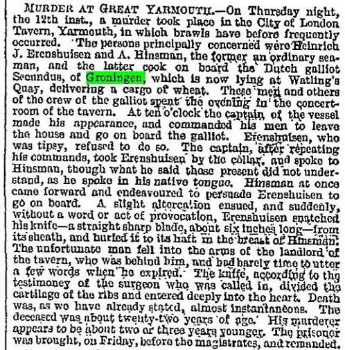 Het betreft de in 1845 geboren tuinierszoon Hinderikus Johannes Erenshuizen. In 1865 stak hij als matroos in een kroeg te Yarmouth de scheepskok A. Hinsman onverhoeds in het hart. Dader en slachtoffer waren collega’s op het Groninger galjootschip Secundus, dat met een lading tarwe in die Oost-Engelse haven lag.