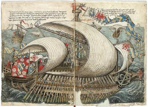 Geplaatst op: 12 oktober 2009 Hoort bij: Geschiedenis 4 reactiesDit is een laat-middeleeuse galei met de maagd Maria hoog in het vaandel, vlakbij het kraaienest. Als je het zo niet zien kunt, door het kleine formaat van deze pika, dan kan je hem hier groot bekijken. En als je dan omlaag gaat langs die mast, zie je een stel trompetters achter dat grootzeil staan. Nog verder naar beneden is een soort draaibassen op de reling gemonteerd. Waarschijnlijk is dit dus een soort van oorlogsbodem. In elk geval varen er pelgrims op die zo nodig naar Jeruzalem moeten. Maar wat nu zo vreemd is: benedendeks zit er niemand aan de riemen. Waar zijn de roeiers? Allemaal met de muziek mee?