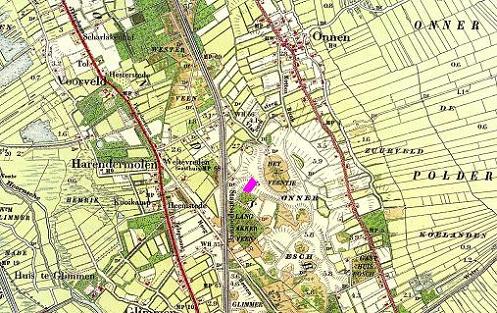 Vervolgens met enig vloeken en zuchten de kadastrale nummers Haren sectie G (3) 531 en 535 opgezocht op de oudste kadasterkaart bij WatWasWaar. De percelen bleken dichterbij Glimmen te liggen, dan bij Onnen. Omdat de Rijksstraatweg (1828) door de omgeving kwam en ook de spoorlijn Assen – Groningen (1869) met later een uitwaaierend rangeerterrein, was de boel nogal grootschalig op de schop gegaan, ook door secundaire wegomleggingen, ontginningen en ruilverkavelingen overigens. Maar door het kaartbeeld van 1828 te vergelijken met dat van begin twintigste eeuw, en dat weer met de huidige situatie, viel er toch uit te komen.