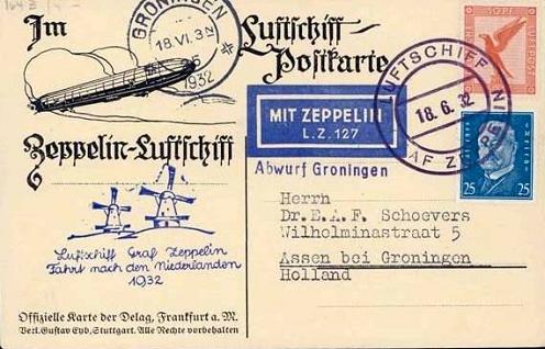 Het is op 18 juni 1932 boven Groningen afgeworpen door een Duitse zeppelin, die een rondvlucht over Nederland maakte. Adressant was een meneer Schoevers te Assen “bei Groningen”. Getuige het tweede stempel werkte de Nederlandse PTT er graag aan mee dat de kaart de bestemming bereikte.