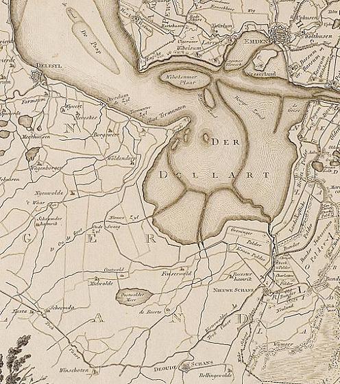 Let op Nesserland, dat schiereilandje tegenover Emden. Op zeker moment breken zee en Eems hier dwars door de kleiwallen heen en ligt het dal in het achterland min of meer open. Tussen 1400 en 1550 ontstaat zo een zeeboezem die qua vorm wel wat doet denken aan een kies met een paar flinke wortels: