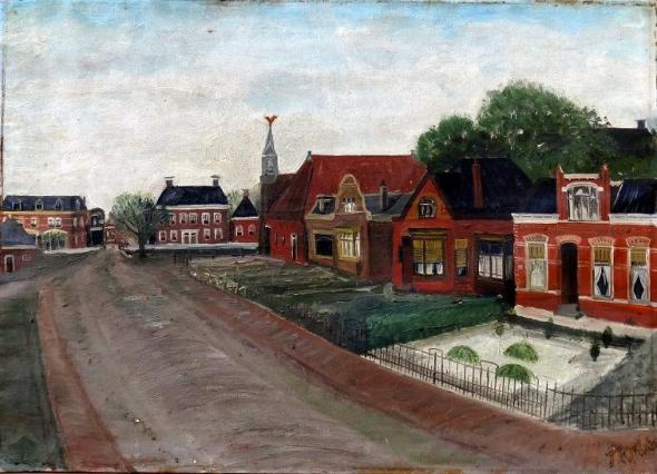 Het schilderij toont de brug in Hoogkerk, we zien links aan het begin van de Kerkstraat cafe Mulder en rechts cafe Reijer in mijn jeugd, ik ben van 1940. De bioerderij van Leutscher stond waar nu de Herv. pastorie staat(arch Meerholz). Hety huis op de voorgrond woonde mevr Leegte er naast woonde later Wouthuis en de slagerij was van Schutter. Moes woonde tegenover cafe Fransen aschuin tegenocer de ingang naar de suikerfabriek . Moes kwam van Den Horn en was meen ik van doopsgezinde huize.