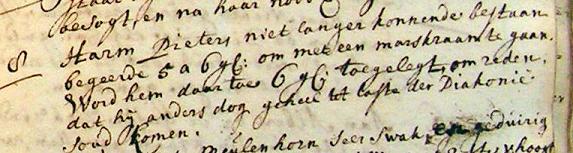 “Harm Pieters niet langer konnende bestaan, begeerde 5 à 6 gl. om met een marskraam te gaan. Word hem daar toe 6 gl. toegelegt, om reden dat hij anders dog geheel tot laste der Diakonie soud komen.”