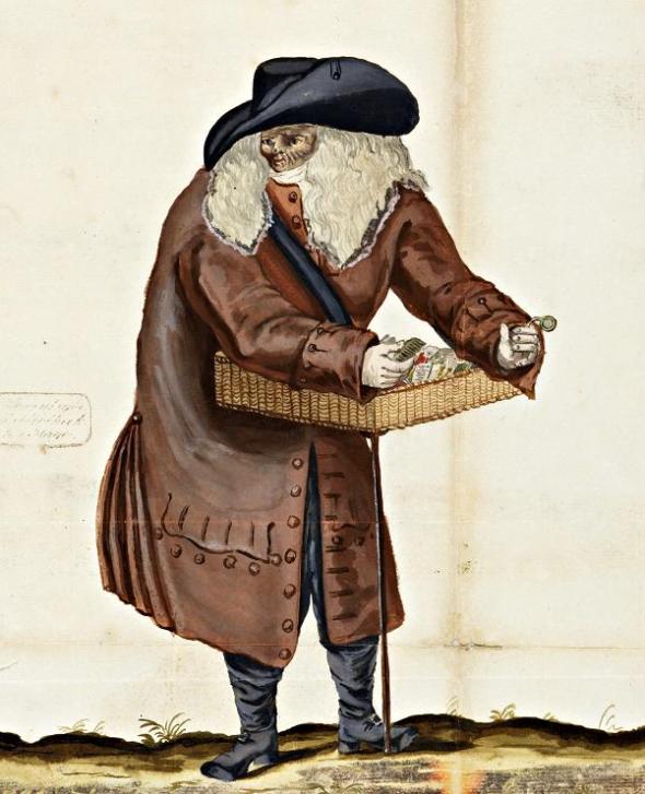 Van zo’n marskraam, waarmee Harm de boer op wilde gaan, zijn er best wel veel plaatjes, eigenlijk. De onderstaande komt uit de Koninklijke Bibliotheek. Zo’n kraam was een platte bak van hout of riet, waarin zich vakjes met kramerijen of kleine handelswaar bevonden. Het kon bijvoorbeeld gaan om garen, band en knopen, flesjes Haarlemmerolie en kwakzalversmiddelen, of volksboekjes en almanakken.