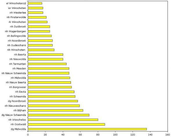 Zoals je ziet loopt die gemiddelde uitgave uiteen van 16 gulden bij de evangelisch-lutherse gemeente Winschoterzijl, tot 136 gulden bij de doopsgezinden van Midwolda e.o.