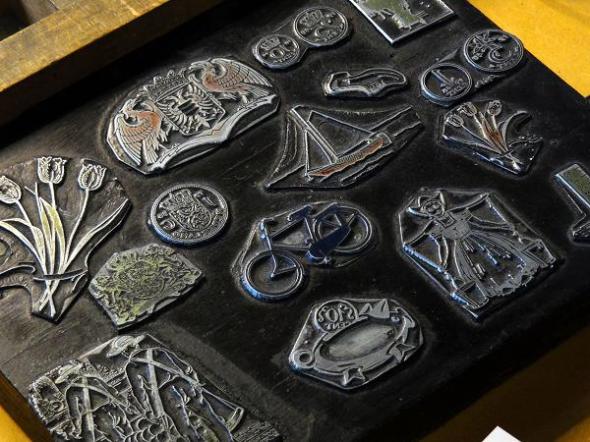 Loodcliché’s uit de collectie van het bedreigde Grafisch Museum met onder meer het Groninger gemeentewapen, een fiets en een melkmeisje: