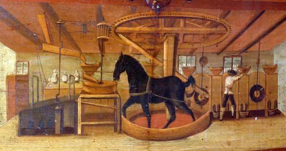 Hij had een kist uit zijn familiebezit bij zich waarop een prachtige evocatie stond van een grutterij met rosmolen: