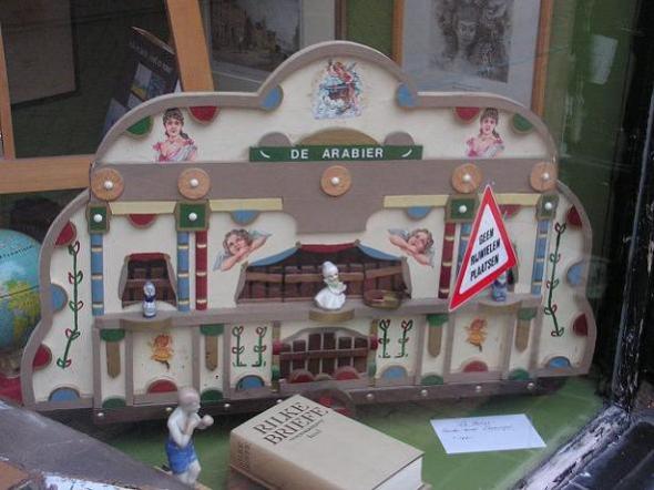 In de etalage van antiquariaat Albert Hoogeveen in de Folkingestraat ontwaren we dit miniatuur draaiorgel. Er zit een bordje op met een naam: ‘De Arabier’. En dat zal het hart van menig Groninger sneller doen kloppen, want menig Groninger vindt het nog steeds doodzonde dat het echte draaiorgel De Arabier naar Amsterdam verhuisde.