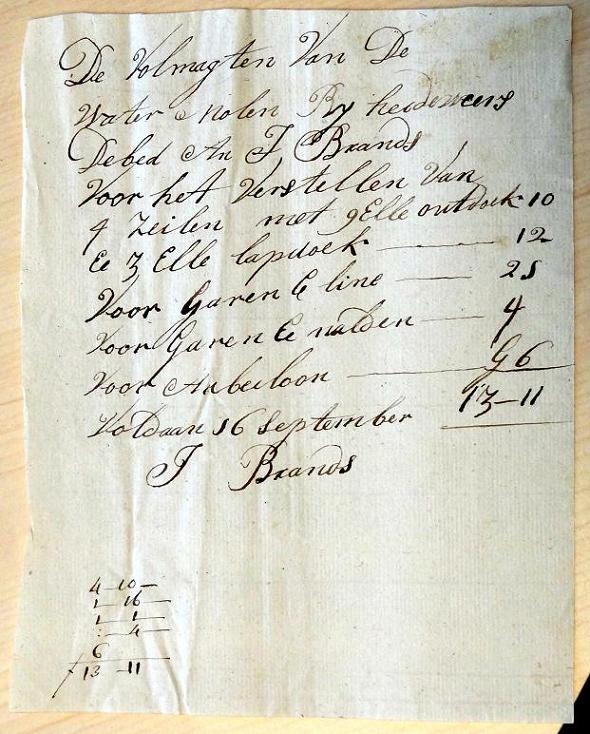 De eerste vier bedragen – voor doek, garen, lijn en naalden – waren in stuivers, het laatste, voor arbeidsloon, in guldens. Tel je nu die 47 stuivers van de eerste posten en de 6 gulden van de laatste op, dan kom je op 8 gulden en 7 stuivers in plaats van de 13 gulden en 11 stuivers als eindbedrag op de rekening. Kon de zeilmaker niet rekenen? Nee, dat was het niet zoals uit het controlesommetje door de boekhouder van de watermolen, linksonder op de nota, blijkt. Van de ellewaren schreef de zeilmaker de prijs per el op, niet de totaalbedragen. Wat zeker geen usance was in deze tijd. Brands had beslist niet lang doorgeleerd, maar dat blijkt ook wel uit zijn ‘langzame’ handschrift. Je ziet bijna hoe hij zijn best doet, ’s avonds bij wat spaarzaam kaarslicht, met het puntje van zijn tong buiten de mond.