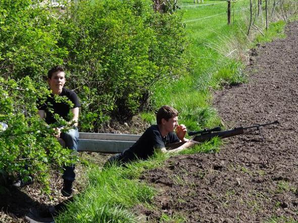 Geen hinderlaag, de jongens schieten op een doel aan de andere kant van het veldje: