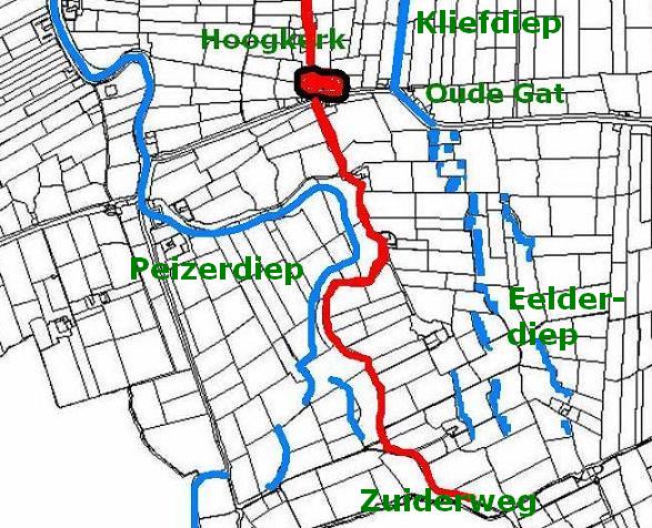 “Het dorp zelf was niet veel”, schrijft Vredewoldius anno 1915 over het Hoogkerk van ruim een halve eeuw eerder. De scribent, zelf waarschijnlijk uit Hoogkerk afkomstig, legt dan uit dat het dorp zich indertijd aan de oostkant uitstrekte “tot ongeveer aan den hoek, waar de weg naar Groningen ombuigt”. Die hoek ligt er in onze tijd nog steeds, het is de rare knik in het Hoendiep tussen de Boeiersingel aan de zuidzijde en UT Delfiaweg aan de noordkant. Volgens Vredewoldius heerste medio 19e eeuw bij deze knik een behoorlijk zompige toestand: