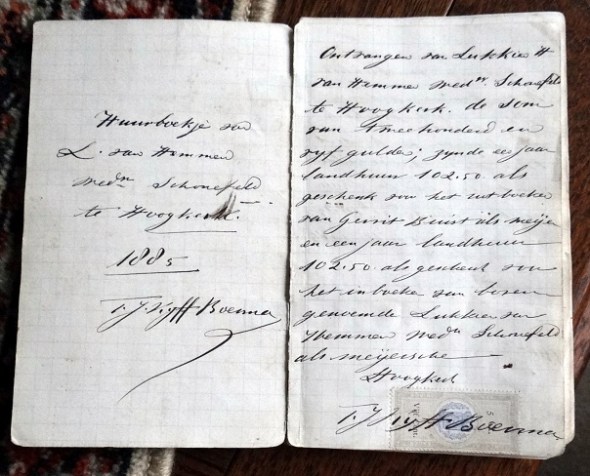 Achter zijn boerderij had Van S. ruim 6 hectare land in beklemming, en het boekje waarin de landeigenaar de kwitanties voor de huurbetalingen aftekende, heeft Van S. nog altijd in zijn bezit. Het begint in 1885, als de eigenaar een Lukkien van Hemmen, wed. Schonefelt als huurster inboekt en daarvoor van haar een jaar huur als (verplicht) ‘geschenk’ krijgt: