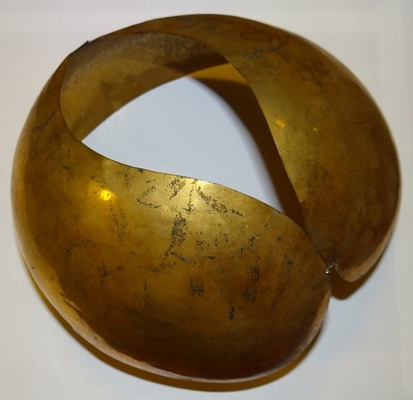 Uit de kast waarin de voorwerpen bewaard werden, kwam ook bovenstaande artefact tevoorschijn. Men wist niet wat het was, maar ik herkende er meteen een oorijzer in. Een Fries oorijzer, dacht ik. Of het van goud of (verguld) koper was, daarover twijfelde ik een beetje. De waarde schatte ik een beetje overmoedig op een paar honderd euro, de eigenaar moest er dus maar zuinig op zijn.