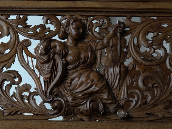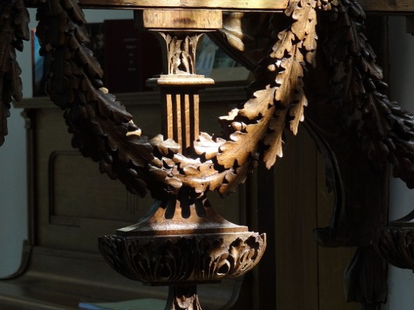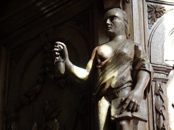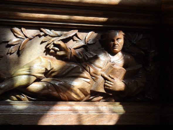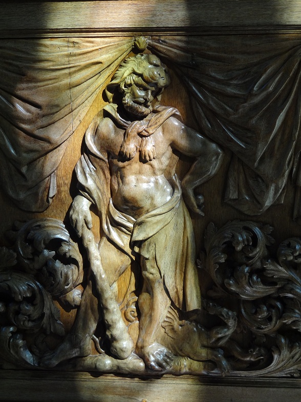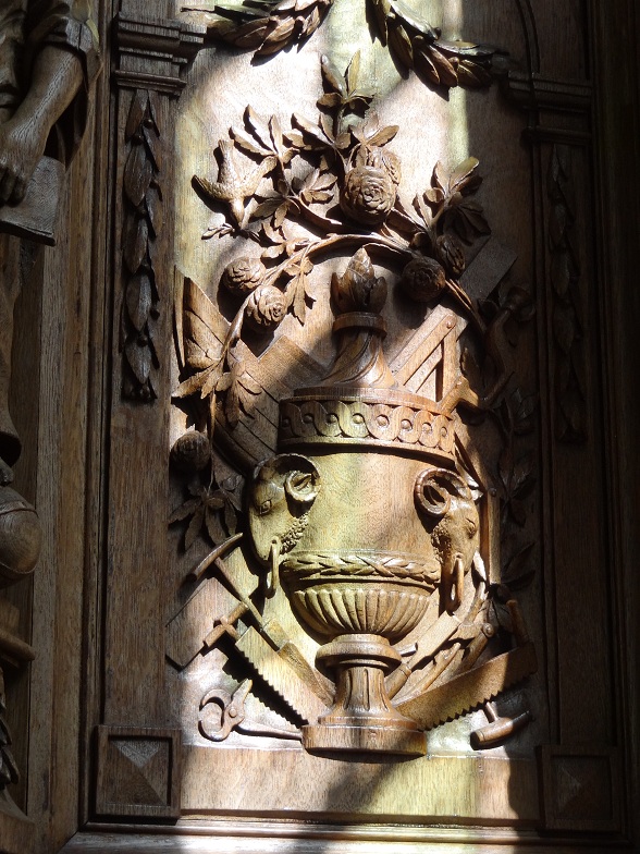 Het houtsnijwerk in de koorboog, dat het herenvertoon erachter accentueert:
