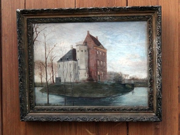 Een schilderijtje op het koor van de pas in 1903 gesloopte borg Dijksterhuis, ooit gebouwd op een buitendijkse oeverwal, waarvan de eigenaren eeuwenlang heren van Pieterburen waren en ook het strandvondersrecht in deze contreien uitoefenden: