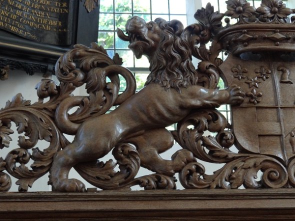 Een van de schildhoudende leeuwen op de herenbank, net als die van Zuidbroek, Uithuizen, Uithuizermeeden en de Nienoordpoort waarschijnlijk gemaakt door Jan de Rijk (1661-1738):