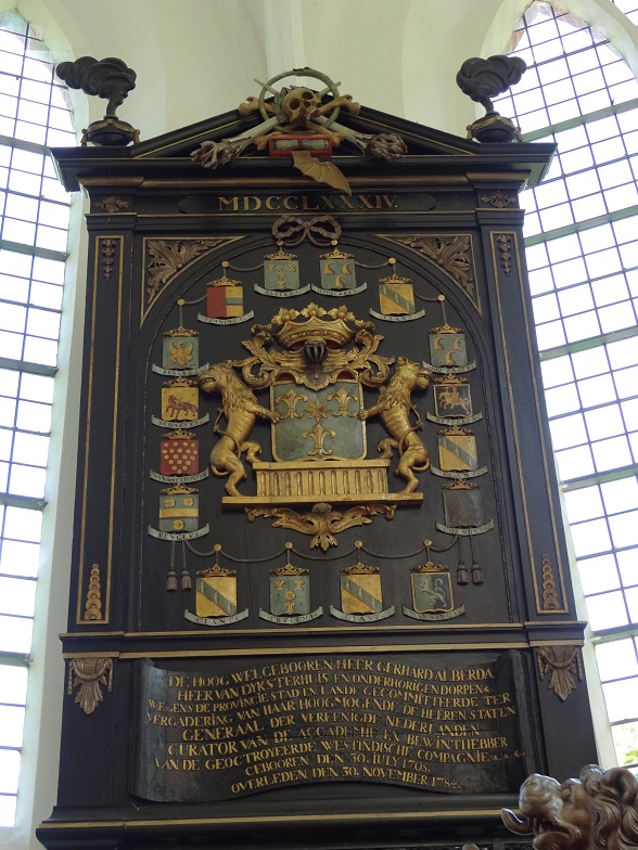 Het meest prominente rouwbord, dat van Gerhard Alberda van Dijksterhuis (1705-1784). Hij was behalve heer van Pieterburen ook nog afgevaardigde van Stad & Lande ter Staten-Generaal, bewindhebber van de West-Indische Compagnie (WIC) en curator van de Groninger academie: