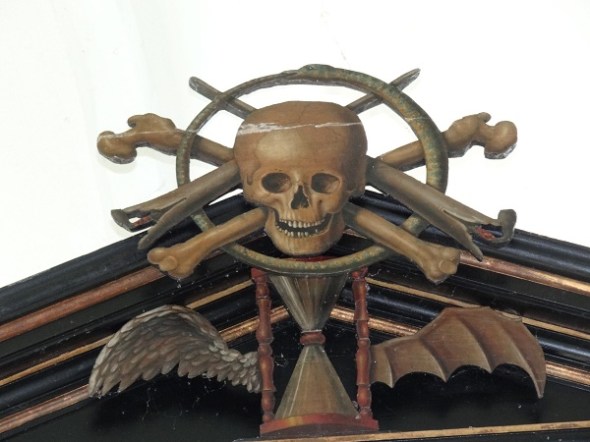 Zag je bij deze een liggende zandloper, op een ander rouwbord staat hetzelfde voorwerp als symbool voor het vervlietende leven rechtop, maar heeft het vleugels van een duif (voor de dag) en een vleermuis (voor de nacht):