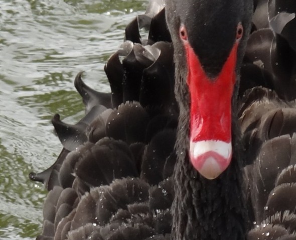 Het is in elk geval wel een mooie foto met die dreigende blik en de glanzende druppeltjes op zijn veren. 🙂