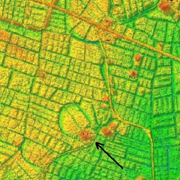 Achter Gravenburg (zie pijl) heb je een prachtige ronde structuur en je bent daarom geneigd te denken dat er een wierde ligt, die dan de naam Kurrelshoogte zal hebben gedragen. Maar dat is verkeerd gedacht. Want raadpleging van de hoogtekaart levert op, dat die ronde structuur een van de meanders van het oer-Peizerdiep aangeeft. Aan de binnenzijde of oostkant van de meanders lag de Gaaikemadijk,  die als een ketting kralen in de vorm van huiswierde-achtige podia verbond, waarvan er ettelijke nog bewaard zijn: