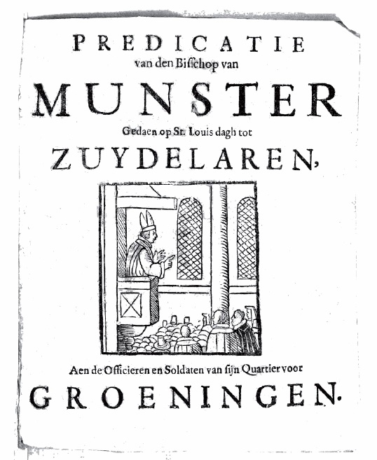 De tekst van een mij onbekend klein pamfletje op vrij slecht papier, gedrukt bij Mattheus Iansz te Amsterdam in de zomer van 1672. Uiteraard betreft het geen echte preek, maar een satire. Nadat een hele ris steden als Zutphen, Deventer, Zwolle, Kampen, en Coevorden gemakkelijk in zijn handen vielen, stoot Bommen Berend zijn neus voor Groningen. Van de wallen daar hoort hij psalm 86 toeteren. Hij lijdt liever geen gezichtsverlies door het beleg op te moeten breken en daarom spoort hij zijn soldaten aan om deze vesting te bestormen. Ze moeten maar niet bang zijn voor de dood, hij belooft ze dat ze het vagevuur mogen overslaan en rechtstreeks naar de hemel gaan. In zijn toverboeken staat weliswaar een heel andere uitslag, maar ach, een bisschop als hij kan de duivel best wel voor het lapje houden.