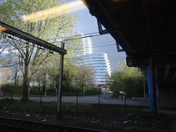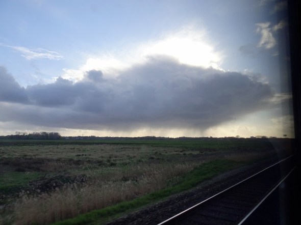 Geen spetje gehad, onderweg, tot station Nieuweschans waar een flinke bui loskwam. Vanuit de trein zag ik ook een bui boven de stad hangen:
