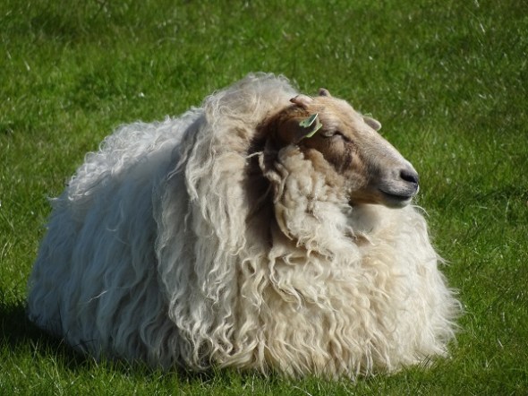 Dit schaap lag lekker in de zon, ondanks zijn enorme vacht. Lijkt me van een aparte soort, de hoorns zijn er grotendeels vanaf gehaald: