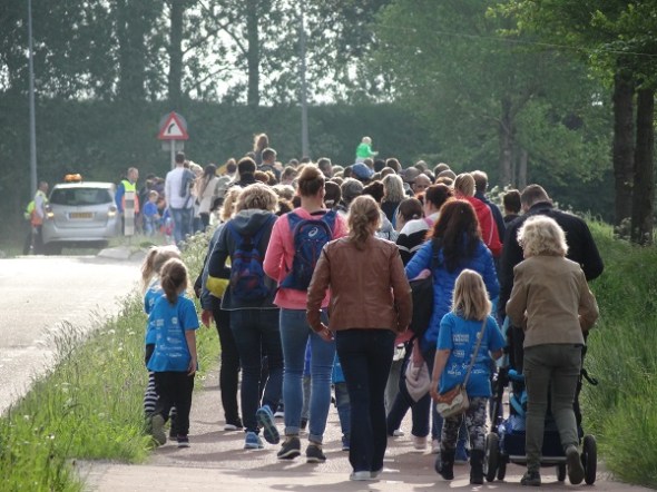 Stukje uit de stoet op de Roderwolderdijk. Van de ongeveer 20 volwassen begeleiders op deze foto zitten er 6 of 7 al wandelend naar het schermpje van hun telefoon te staren. Deze mensen nemen hoogstens iets van de omgeving mee, als er virtueel wat van getoond wordt. Ze kunnen de kinderen er vast veel over vertellen.