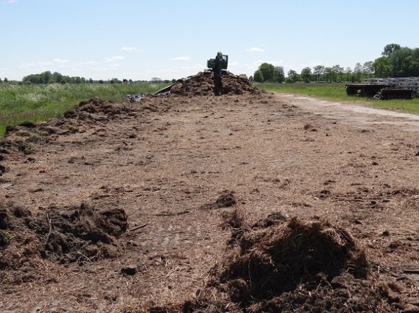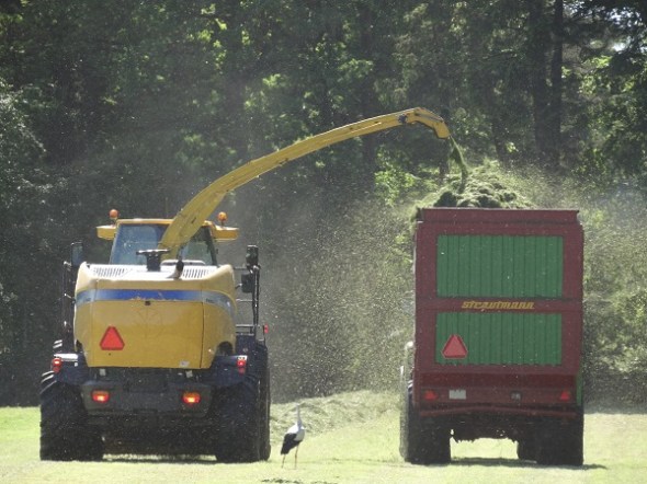 Het inhalen van gras bij Mensinge, Roden – een ooievaar volgt het van nabij: