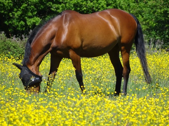 Met hooguit 19 graden was het niet al te warm. Desalniettemin zweterig paard graast op de Weehorst:
