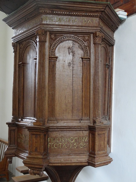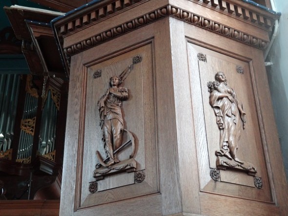 Kansel uit 1560 met formeel snijwerk: