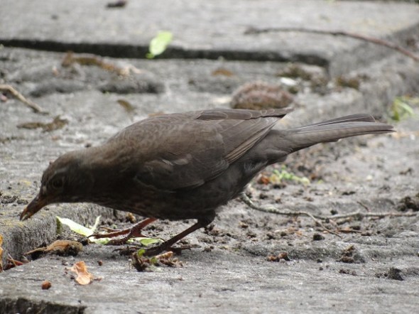 Op het kerkhof was een merelvrouwtje druk bezig met het peuren van voedsel uit de spleet tussen twee grafstenen: