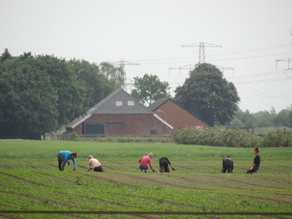 Wiedsters van een uitzendbureau bezig op een veld van een boomkwekerij. Sommige doen het werk liever staand of hurkend dan op hun knieën en ik kan ze geen ongelijk geven, maar of het werk dan net zo hard opschiet?:
