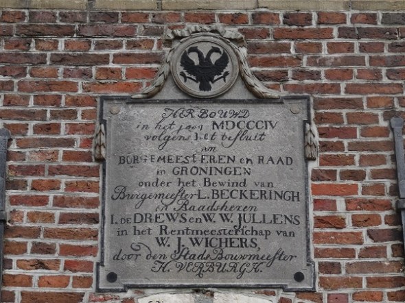 Gevelsteen boven de kerkdeur van Oude Pekela. Het Groninger stadsbestuur  liet de kerk in 1739 herbouwen door stadsbouwmeester Verburgh en ik vermoed dat het bestek nog wel ergens te vinden is: